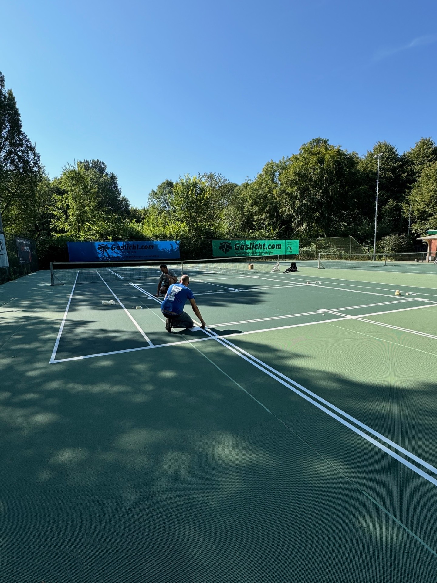 Uiteraard moet het wel droog zijn als de belijning wordt aangebracht. Voor de pickleballers is het dus even behelpen met 2 banen. Maar daarna kunnen we op 4 professionele banen Pickleballen!